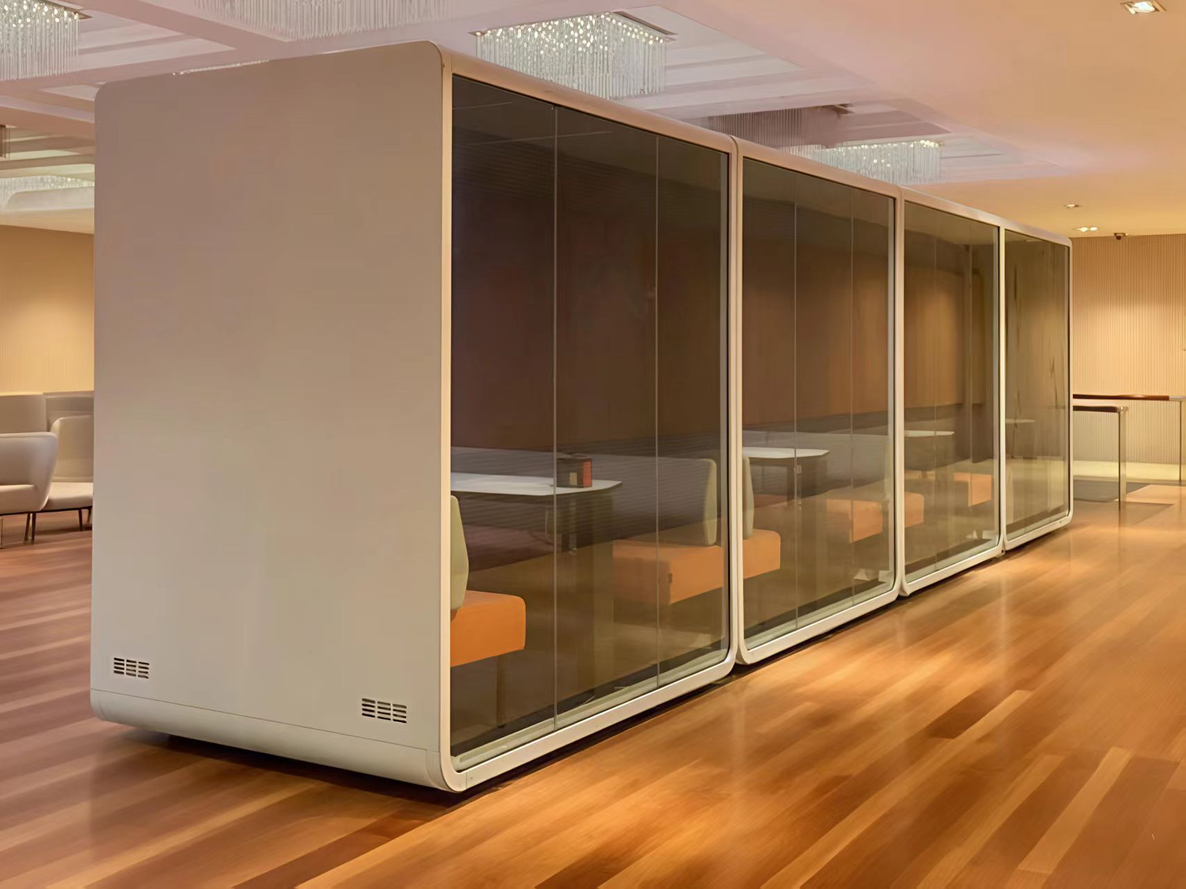Das Zentrum stellte Tamadas schalldichte Chat-Pod, konzipiert als modulare Privatkabine mit hervorragender Schalldämmung. Jede Kapsel verfügt über: